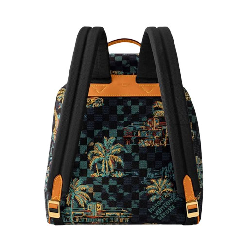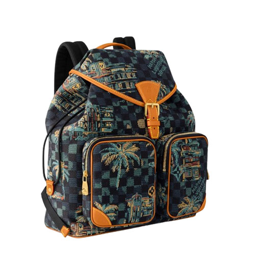 Recognizable by its rounded shape, drawstring closure, and comfortable shoulder straps, the Montsouris Cargo Backpack turns heads in jacquard cotton with a woven design depicting Miami and its vibrant nightlife. Finished with natural leather trim, the design takes on a slight vintage feel. The pack now features two outside pockets on the front, adding convenience.