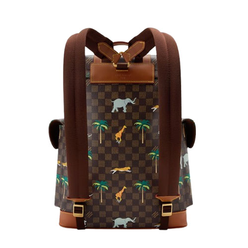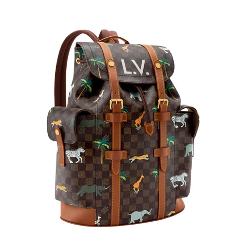 The rugged Christopher MM backpack is crafted from Damier Heritage coated canvas, customized with a print of wild beasts charging through palm trees as part of The Darjeeling Limited collection. The darker colorway is accented with brown leather trim. Bold white L.V. initials on the flap echo the film’s Louis Vuitton luggage.