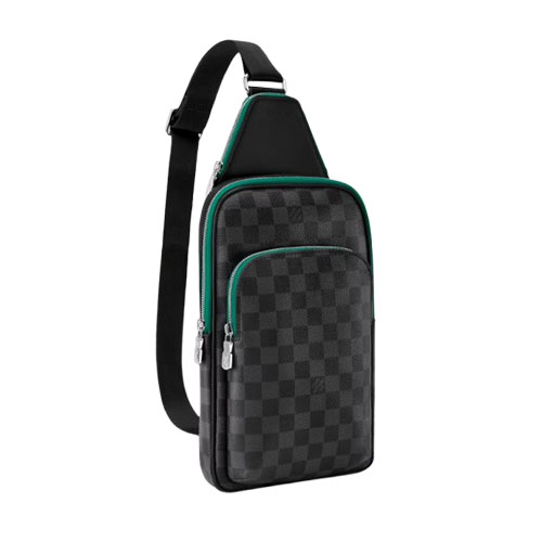 The Avenue Slingbag PM is crafted from Damier Graphite canvas, with bright green leather trim that complements the gray-and-black checkerboard pattern. This cross-body bag features a zipped main compartment, a front zipped pocket, and a small triangular pocket at the top, offering both style and practical storage.