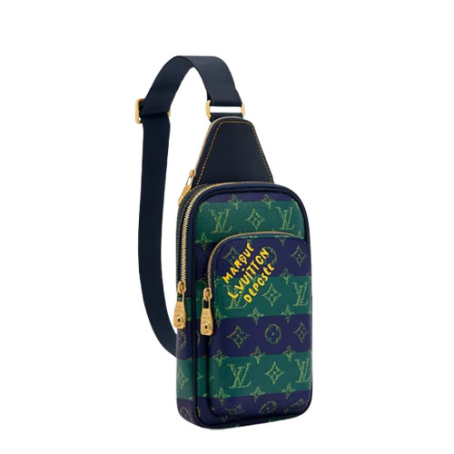 Fashioned from striped Monogram Heritage coated canvas with blue-leather trim, this Avenue Slingbag PM is a practical small bag. This cross-body bag has a zipped main compartment, lined in saffron-colored textile, and a convenient front zipped pocket. For smaller belongings, there’s a triangular pocket attached to the top of the bag where it meets the strap.